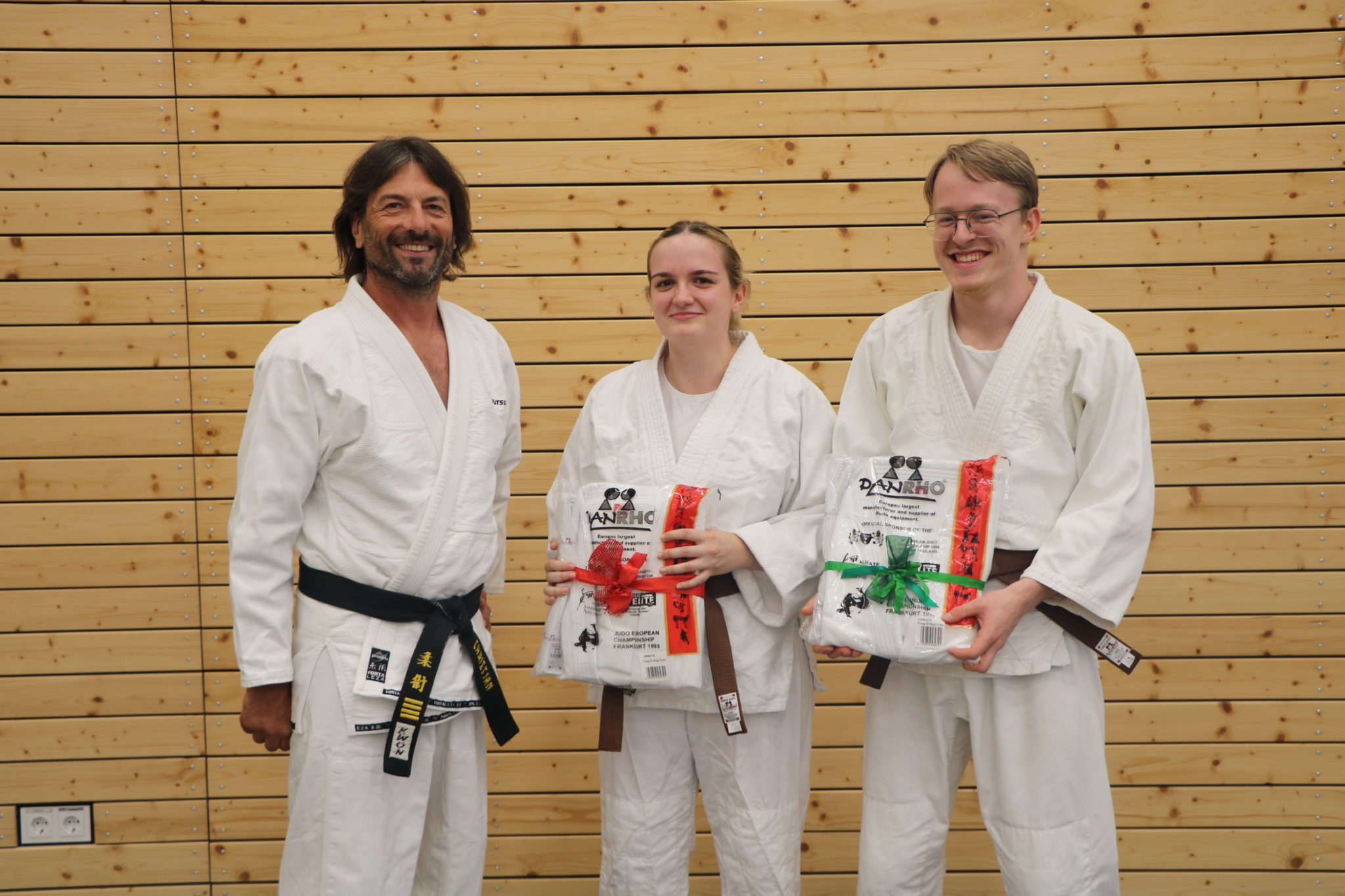 Die theoretischen Themen waren unter anderem: Trainings- und Lehrmethoden, Fehlerkorrektur, Frauen- und Seniorenselbstverteidigung, Sportmedizin und Erstversorgung von Verletzungen, Wettkampfregeln, Psychologie in der SV u.s.w. Die praxisbezogene Ausbildung befasste sich mit: Hilfs-und Trainingsmittel, Notwehr, Bewegungslehre, Fallschule, Wurf-Hebel-Schlag- und Tritttechniken, Gegen-und Weiterführungstechniken, Verteidigung in der Bodenlage, Frauen-SV, Waffenabwehr, Verteidigung gegen mehrere Angreifer, Wettkampf und vielem mehr. Also das ganze Repertoire des Ju-Jutsu. Im letzten Training hieß Abteilungsleiter Christian Straßer die neuen Trainer mit einem kleinen Geschenk im Trainerteam Ju-Jutsu des TVD willkommen. Nina und Andy werden überwiegend im Kinder- und Jugendbereich nach den Sommerferien unterrichten.